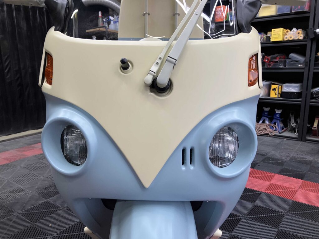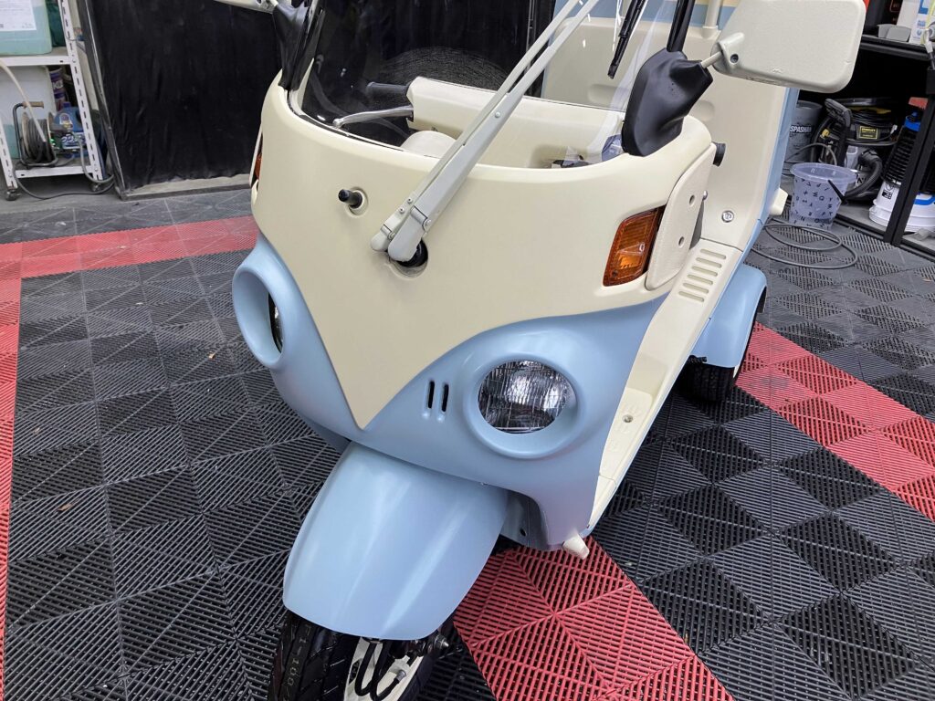 ライトブルー×アイボリーのツートンカラーが目を引く、完成度の高いカスタムコンプリート車両です。