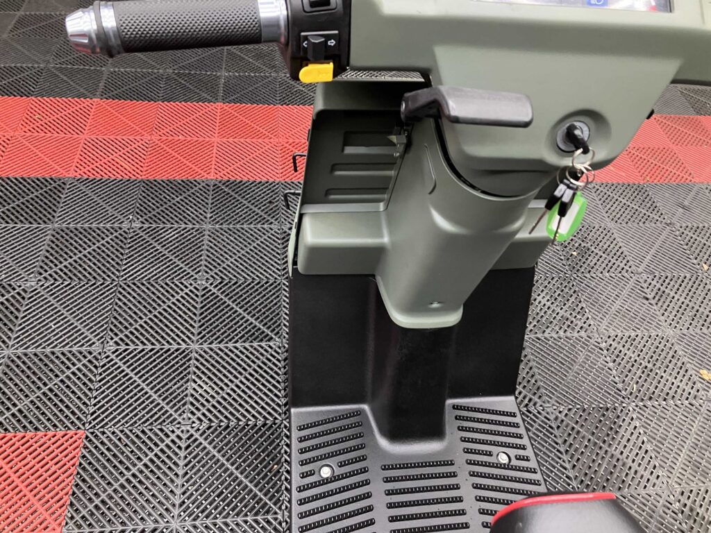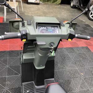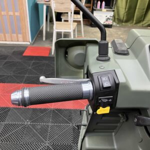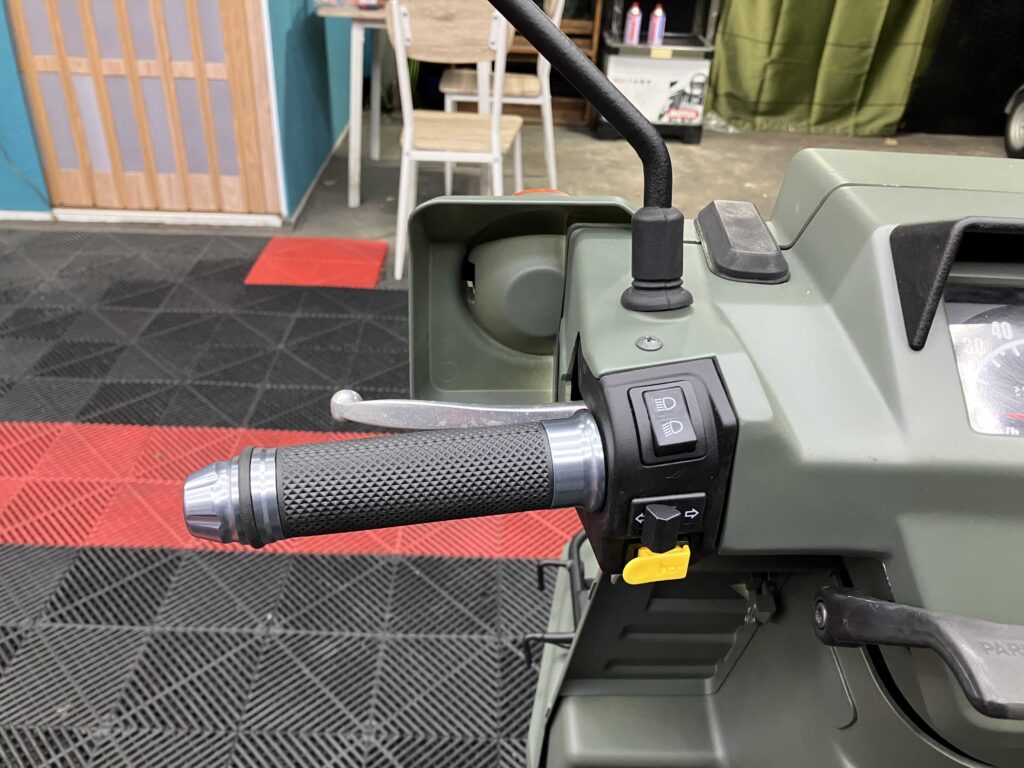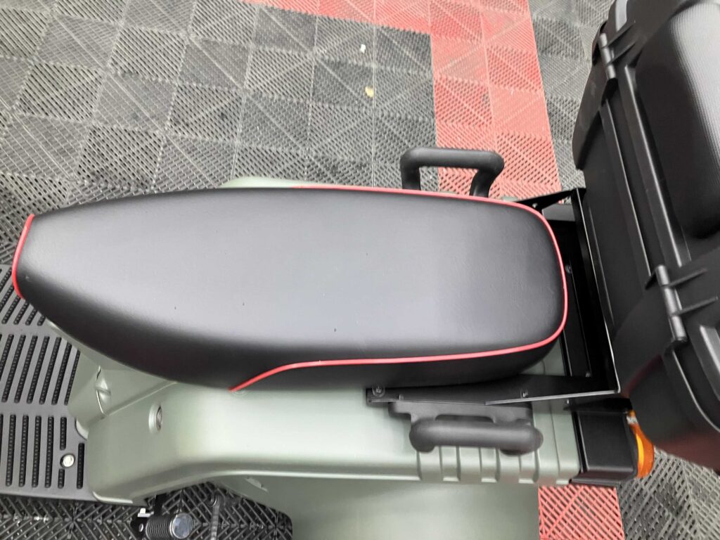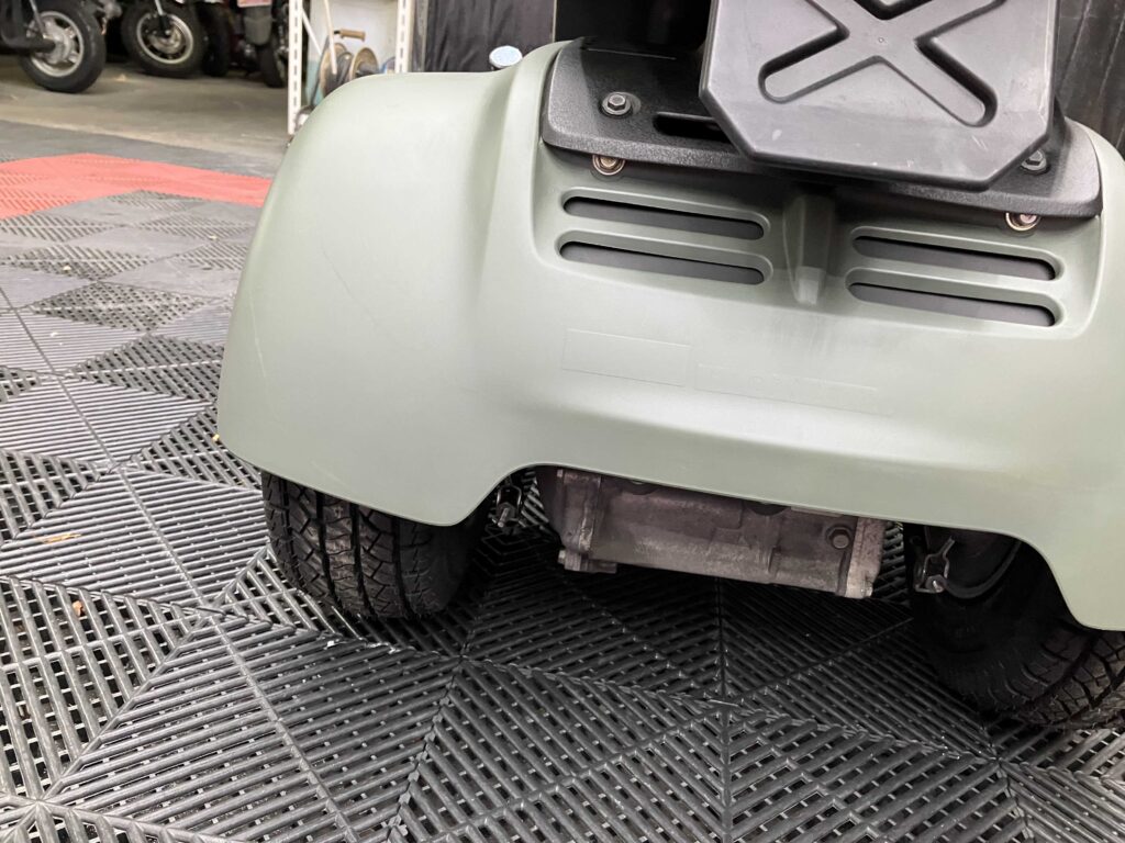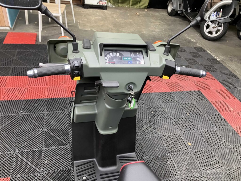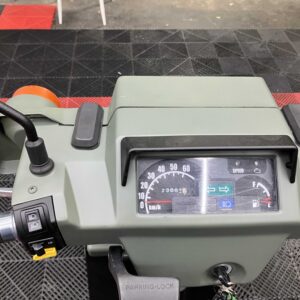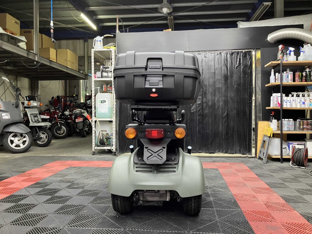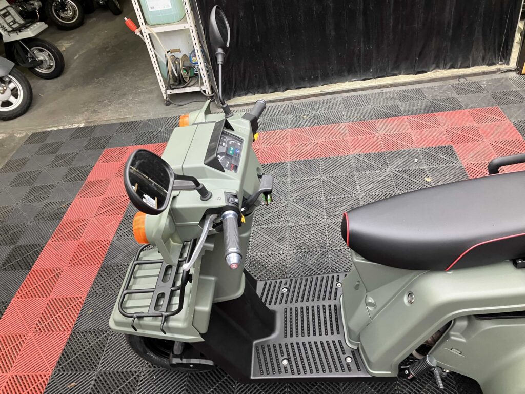 外装はカーキ×ブラックで全体的にきれいな印象を保っており、シート・キャリア・リアボックスは新品装着済み。